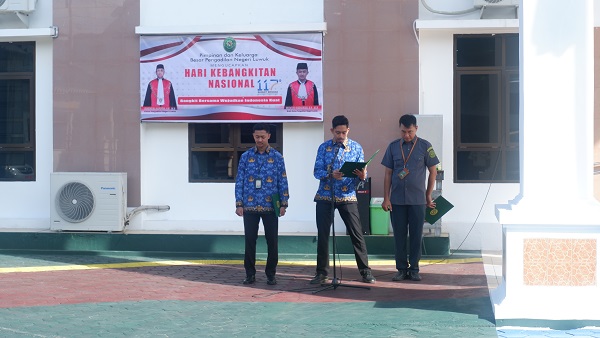 Luwuk, 20 Mei 2025. Pada hari Selasa pagi bertempat di Halaman Kantor Pengadilan Negeri Luwuk, berlangsung kegiatan Upacara dalam rangka memperingati Hari Kebangkitan Nasional ke-117 Tahun 2025. Pelaksanaan upacara ini di pimpin langsung oleh Wakil Ketua Pengadilan Negeri Luwuk Bapak Widodo Hariawan, S.H., M.H. dan di ikuti oleh para Hakim, Panitera, para Panitera Muda, Pejabat struktural dan fungsional serta para PPNPN pada Pengadilan Negeri Luwuk. Tema peringatan hari Kebangkitan Nasional ke-117 tahun 2025 ini adalah “Bangkit Bersama Wujudkan Indonesia Kuat”.