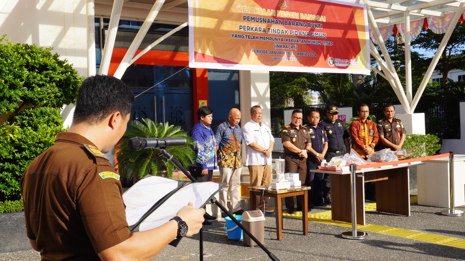 Luwuk, 26 April 2024. Pada hari Jumat Sore bertempat di Kantor Halaman Kejaksaan Negeri Banggai, Perwakilan dari Pengadilan Negeri Luwuk Bapak Aditya, S.H. menghadiri kegiatan pemusnahan barang bukti perkara Tindak Pidana Umum yang telah memperoleh kekuatan Hukum tetap (Inkracht) Periode Bulan Januari sampai dengan April Tahun 2024. Kegiatan ini dipimpin langsung oleh Kepala Kejaksaan Negeri banggai.
