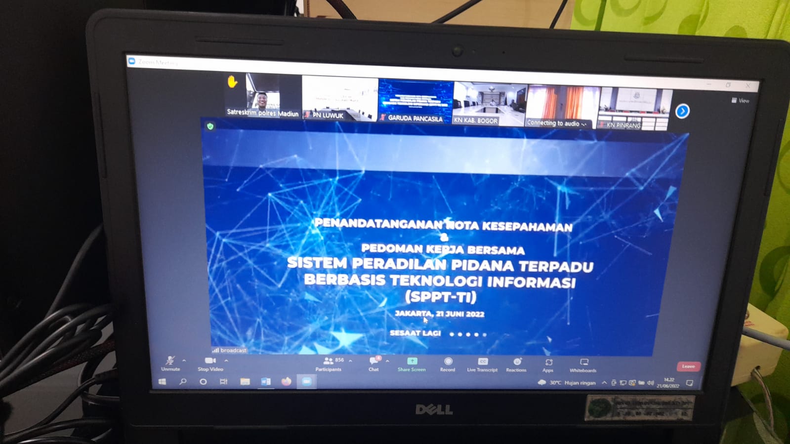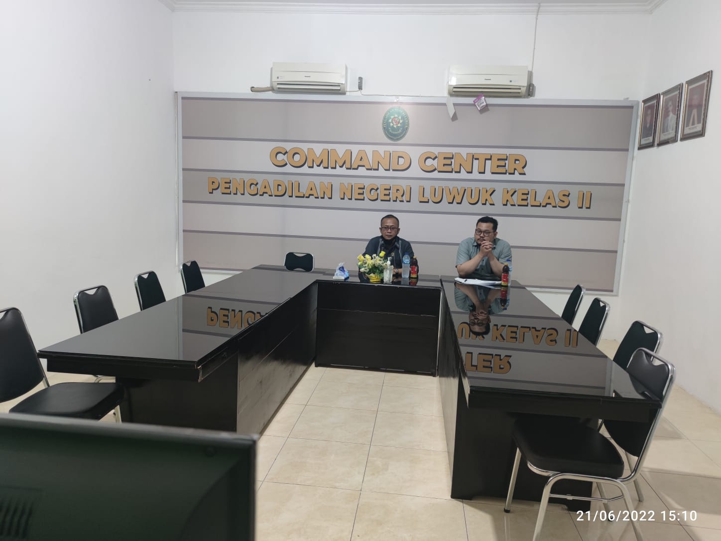 Luwuk, 21 Juni 2022, Bertempat di Ruang Command Center Pengadilan Negeri Luwuk, Wakil Ketua Pengadilan Negeri Luwuk dan Hakim Pengadilan Negeri Luwuk mengikuti acara Penandatanganan Nota Kesepahaman dan pedoman Kerja Bersama Sistem Peradilan Pidana Terpadu Berbasis Teknologi Informasi (SPPT-TI) oleh Ketua Mahkamah Agung, Kepala Kepolisian Republik Indonesia, jaksa Agung dan Pimpinan Kementerian / Lembaga Lainnya yang bertempat di Mahkamah Agung secara online.