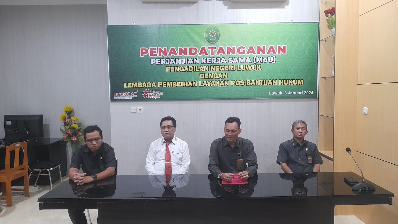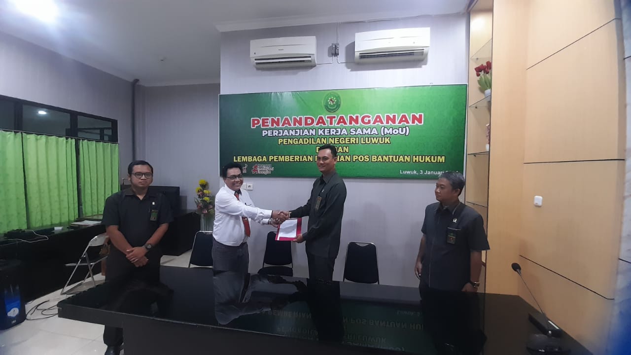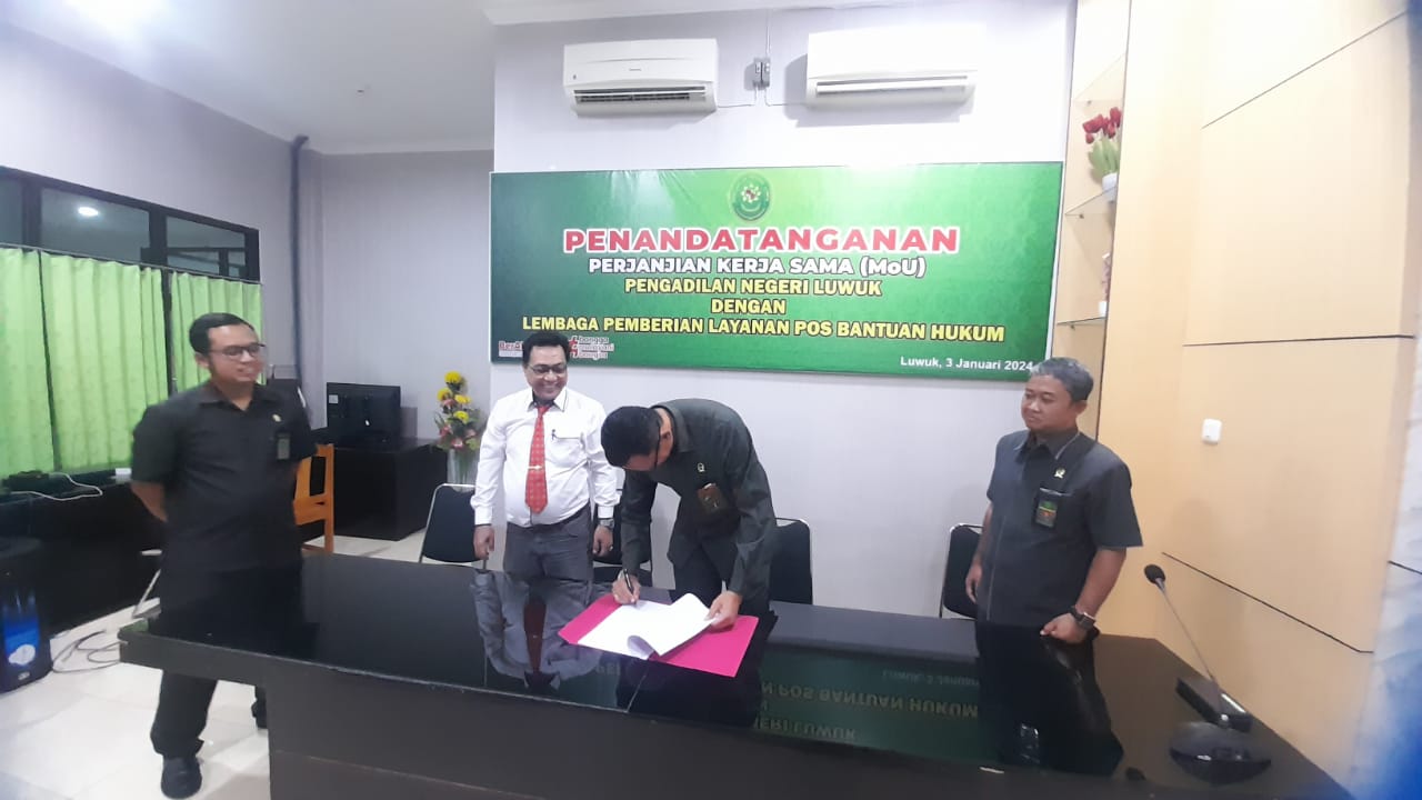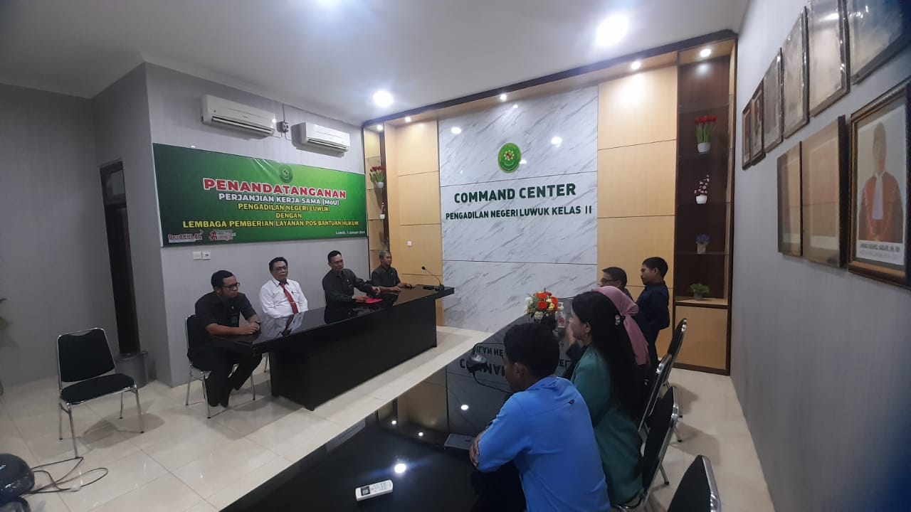 Luwuk, 03 Januari 2024. Pada hari Rabu siang bertempat di Ruang Command Center Pengadilan Negeri Luwuk, berlangsung kegiatan penandatanganan perjanjian kerjasama antara Pengadilan Negeri Luwuk dengan Lembaga Pemberian Layanan Pos Bantuan Hukum. Sesuai dengan hasil dari seleksi terbuka pengisian Lembaga Pemberi Layanan Pos Bantuan Hukum (POSBAKUM) pada Pengadilan Negeri Luwuk Tahun Anggaran 2024, panitia pelaksanaan seleksi terbuka memutuskan YLBH APIK Sulteng yang terpilih dalam proses seleksi tersebut. Kegiatan ini dihadiri oleh Ketua Pengadilan Negeri Luwuk, Wakil Ketua Pengadilan Negeri Luwuk, perwakilan dari YLBH APIK Sulteng, dan Panitia Seleksi. Selamat!!