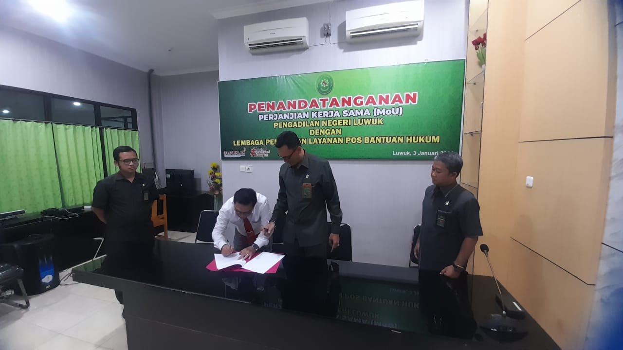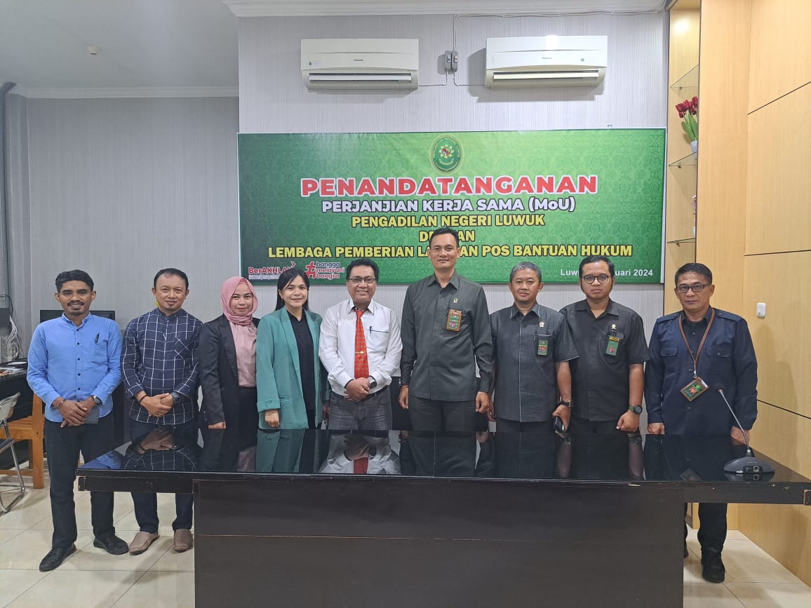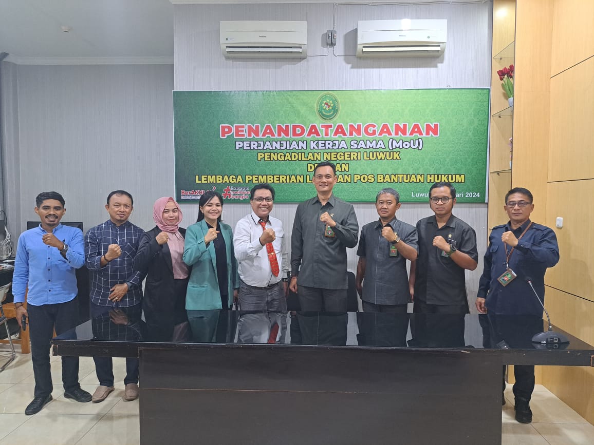 Luwuk, 03 Januari 2024. Pada hari Rabu siang bertempat di Ruang Command Center Pengadilan Negeri Luwuk, berlangsung kegiatan penandatanganan perjanjian kerjasama antara Pengadilan Negeri Luwuk dengan Lembaga Pemberian Layanan Pos Bantuan Hukum. Sesuai dengan hasil dari seleksi terbuka pengisian Lembaga Pemberi Layanan Pos Bantuan Hukum (POSBAKUM) pada Pengadilan Negeri Luwuk Tahun Anggaran 2024, panitia pelaksanaan seleksi terbuka memutuskan YLBH APIK Sulteng yang terpilih dalam proses seleksi tersebut. Kegiatan ini dihadiri oleh Ketua Pengadilan Negeri Luwuk, Wakil Ketua Pengadilan Negeri Luwuk, perwakilan dari YLBH APIK Sulteng, dan Panitia Seleksi. Selamat!!