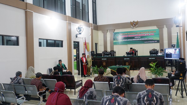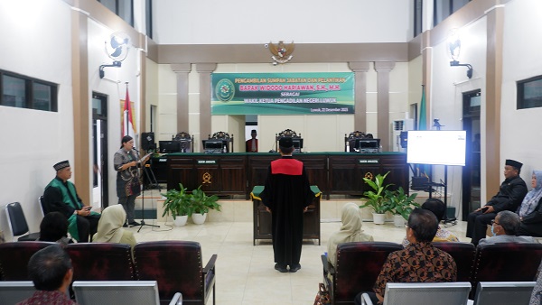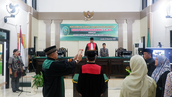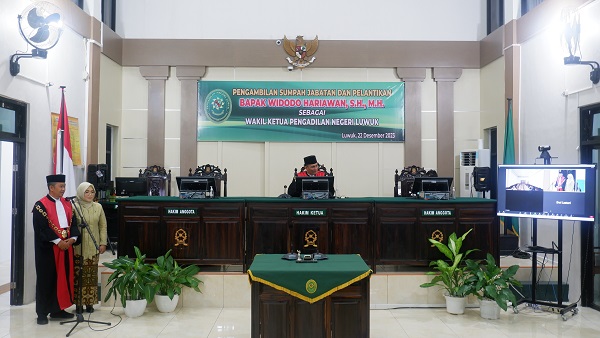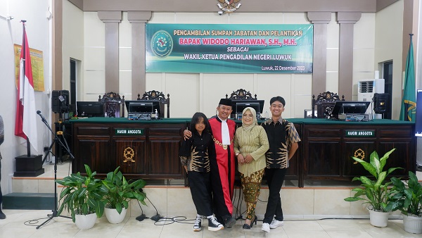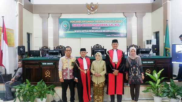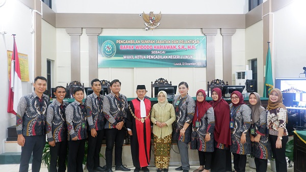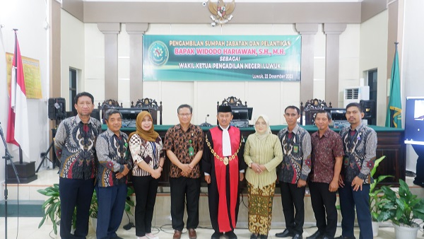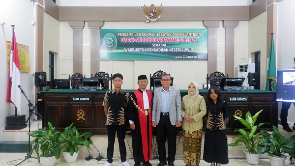 Luwuk, 22 Desember 2023. Pada hari jumat pagi, bertempat di ruang sidang utama kantor Pengadilan Negeri Luwuk dilaksanakan kegiatan Pengambilan Sumpah Jabatan dan Pelantikan Bapak Widodo Hariawan, S.H., M.H. sebagai Wakil Ketua Pengadilan Negeri Luwuk. Bapak Widodo Hariawan, S.H., M.H. sebelumnya bertugas menjadi Hakim pada Pengadilan Negeri Tanjung Pinang Kelas I A dan pada bulan November 2023 mendapatkan promosi menjadi Wakil Ketua Pengadilan Negeri Luwuk Kelas II. Acara diawali dengan menyanyikan lagu Indonesia Raya dan Hyme Mahkamah Agung RI, dilanjutkan dengan pengambilan sumpah yang dipimpin langsung oleh Ketua Pengadilan Negeri Luwuk, Bapak I Made Aditya Nugraha, S.H., M.H. Kegiatan tersebut dihadiri oleh seluruh keluarga besar Pengadilan Negeri Luwuk, Ibu-ibu Dharmayukti Karini Cabang Luwuk dan tamu undangan. Acara ditutup dengan pemberian ucapan selamat dan foto bersama dengan para tamu undangan dan keluarga besar Pengadilan Negeri Luwuk. Selamat!