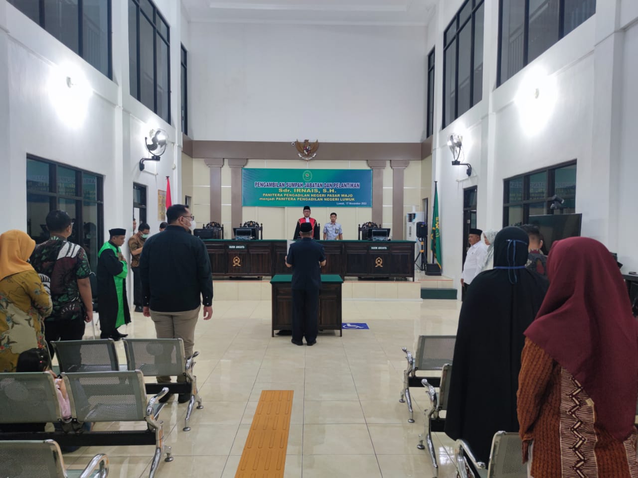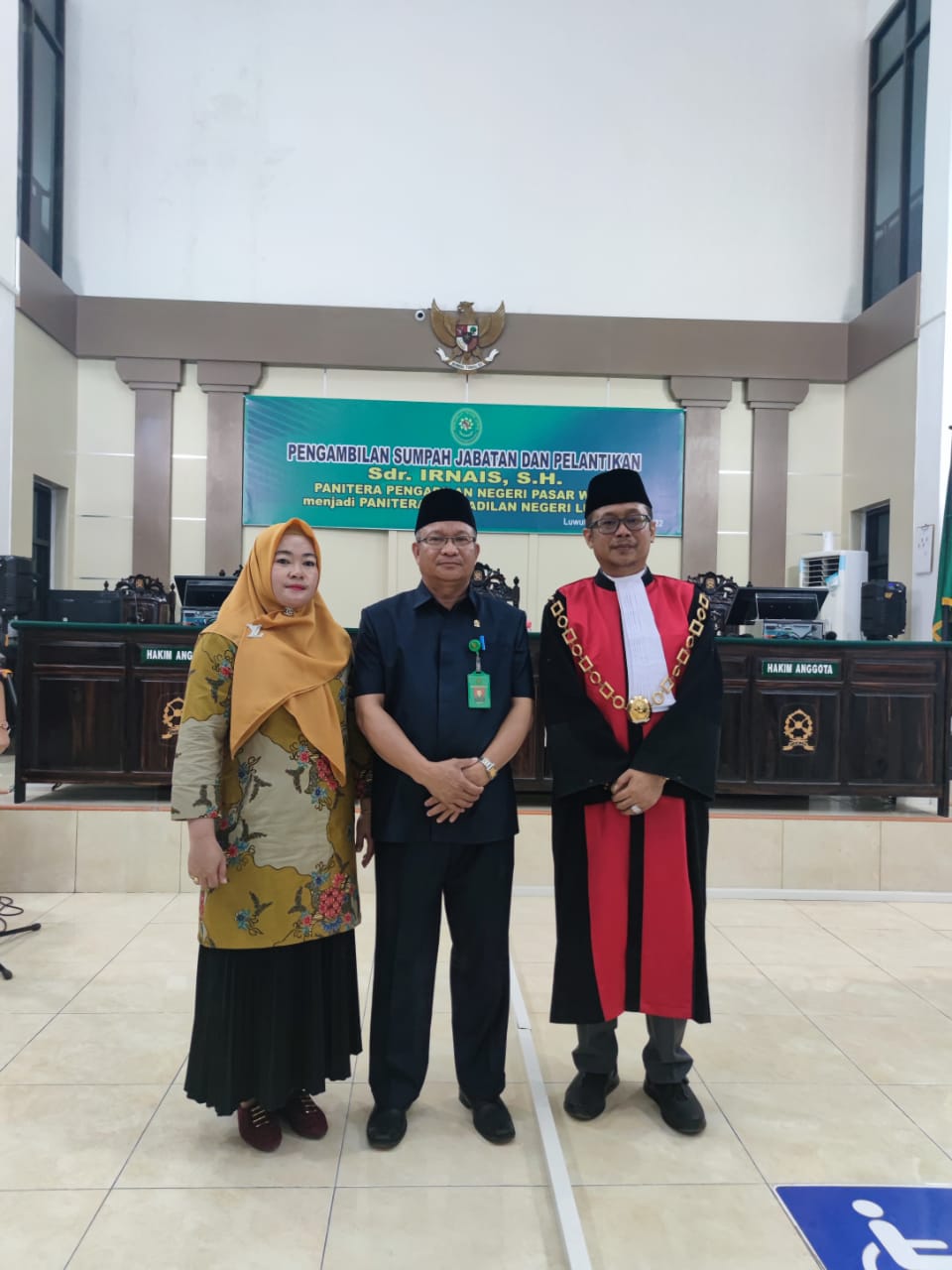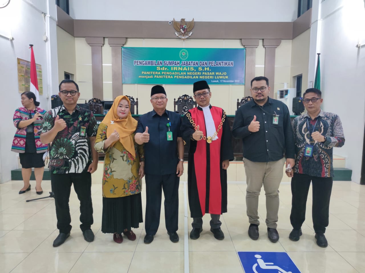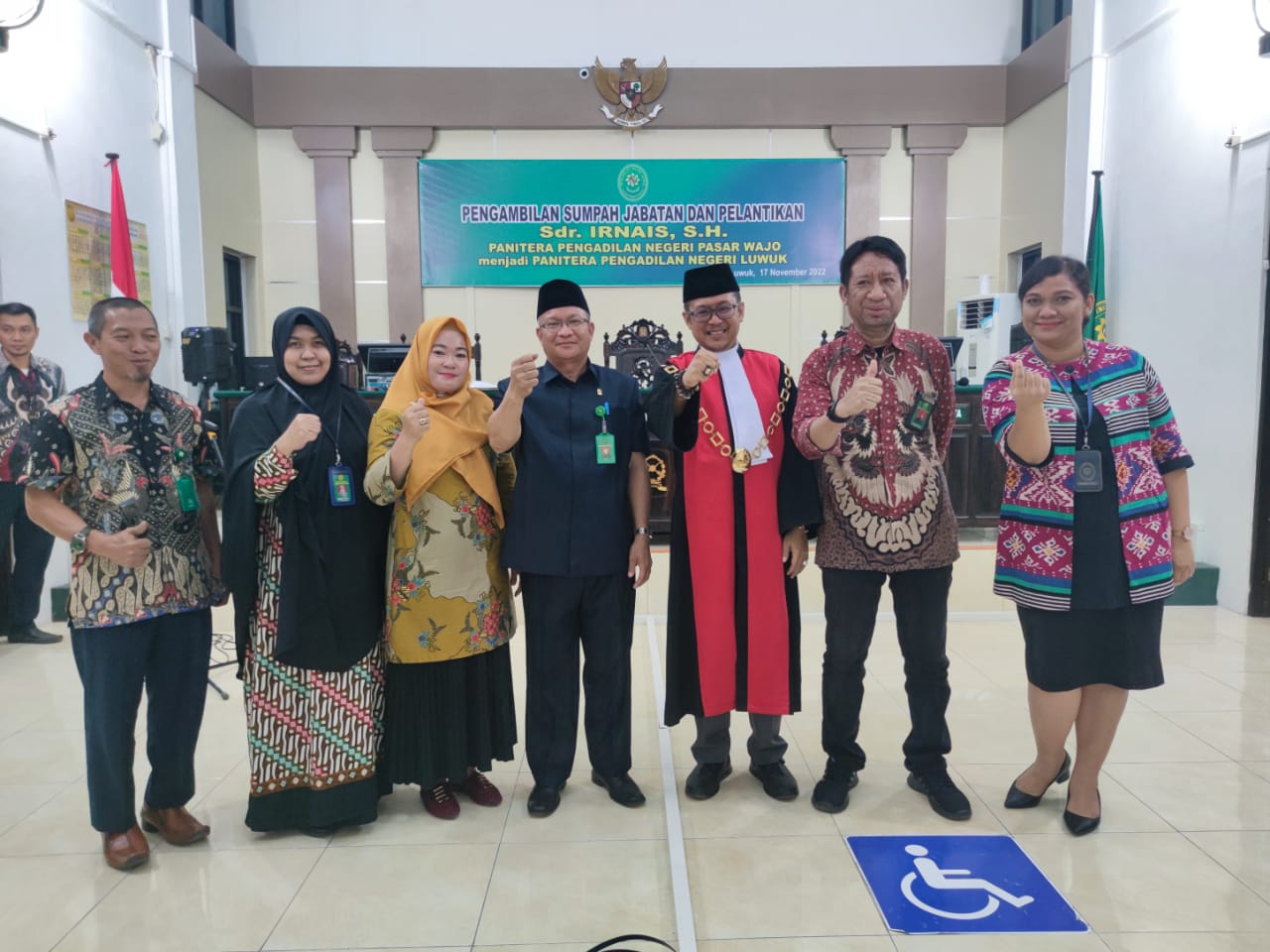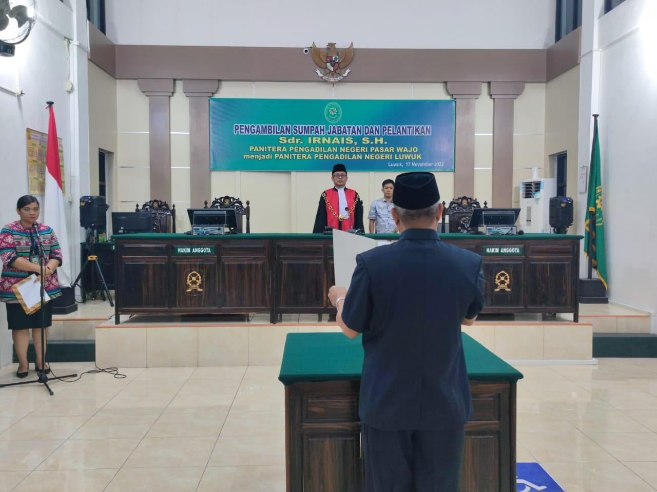 Kamis, 17 November 2022, Bertempat di ruang sidang utama kantor Pengadilan Negeri Luwuk dilaksanakan pelantikan dan pengambilan sumpah Bapak Irnais, S.H sebagai Panitera Pengadilan Negeri Luwuk. Acara diawali dengan menyayikan lagu Indonesia Raya dan Hymne Mahkamah Agung RI, dilanjutkan dengan pengambilan sumpah yang dipimpin langsung oleh Wakil Ketua Pengadilan Negeri Luwuk Bapak Eka Prasetya Pratama, S.H., M.H. Kegiatan tersebut diikuti oleh seluruh keluarga besar Pengadilan Negeri Luwuk. Acara ditutup dengan pemberian ucapan selamat dan foto bersama dengan para tamu undangan dan keluarga besar Pengadilan Negeri Luwuk