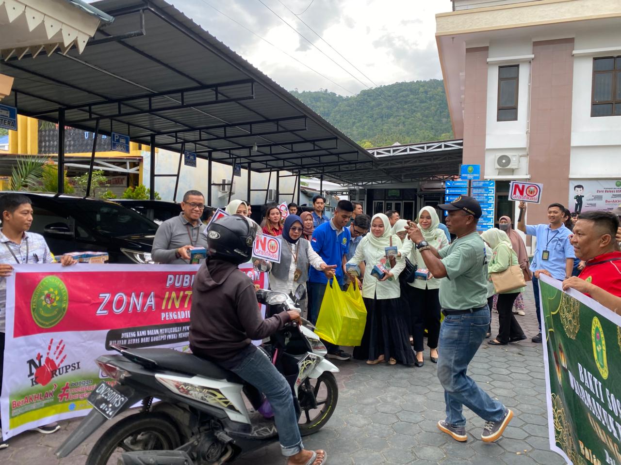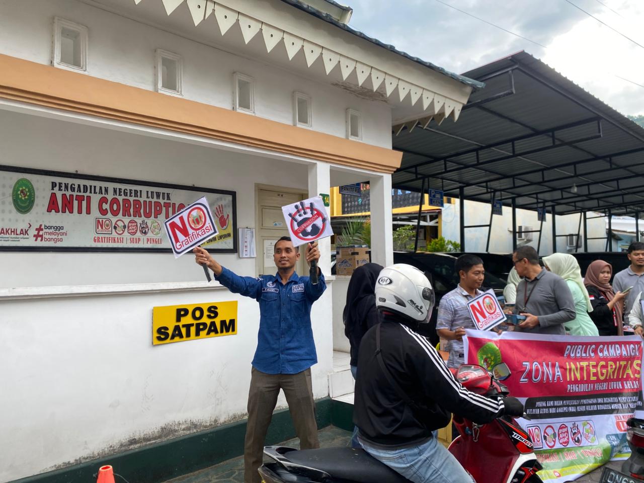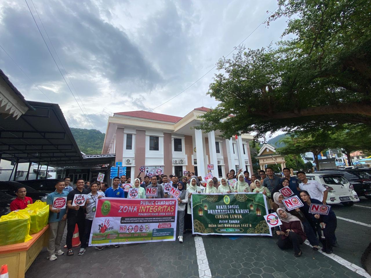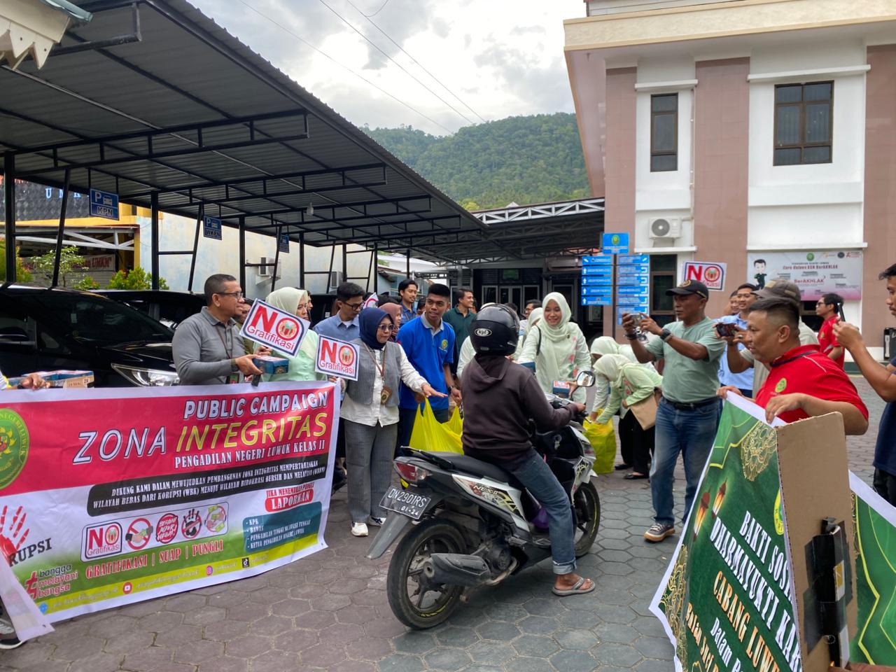 Luwuk, 13 Maret 2026. Dalam rangka mewujudkan program Pembangunan Zona Integritas Mempertahankan Wilayah Bebas Korupsi (WBK) dan menuju Wilayah Birokrasi Bersih Melayani (WBBM) tahun 2026, Pengadilan Negeri Luwuk pada hari Jumat tanggal 13 Maret 2026 menggelar kegiatan Public Campaign yang dirangkaikan dengan pembagian takjil gratis bagi pengendara kendaraan bermotor yang sedang lewat di sekitar lingkungan kantor Pengadilan Negeri Luwuk. Tidak lupa di selipkan dalam takjil berupa stiker Anti gratifikasi dan anti suap yang dibagikan ke masyarakat. Kegiatan ini bertujuan untuk mensosialisasikan dan menunjukkan komitmen kuat dari Pengadilan Negeri Luwuk dalam melakukan pembangunan Zona Integritas guna mempertahankan Wilayah Bebas Korupsi (WBK) menuju Wilayah Birokrasi Bersih Melayanai (WBBM) serta mengajak seluruh Masyarakat untuk ikut mengawal dan mengawasi pembangunan Zona Integritas pada Pengadilan Negeri Luwuk. Kegiatan ini di ikuti oleh seluruh Keluarga Besar Pengadilan Negeri Luwuk.