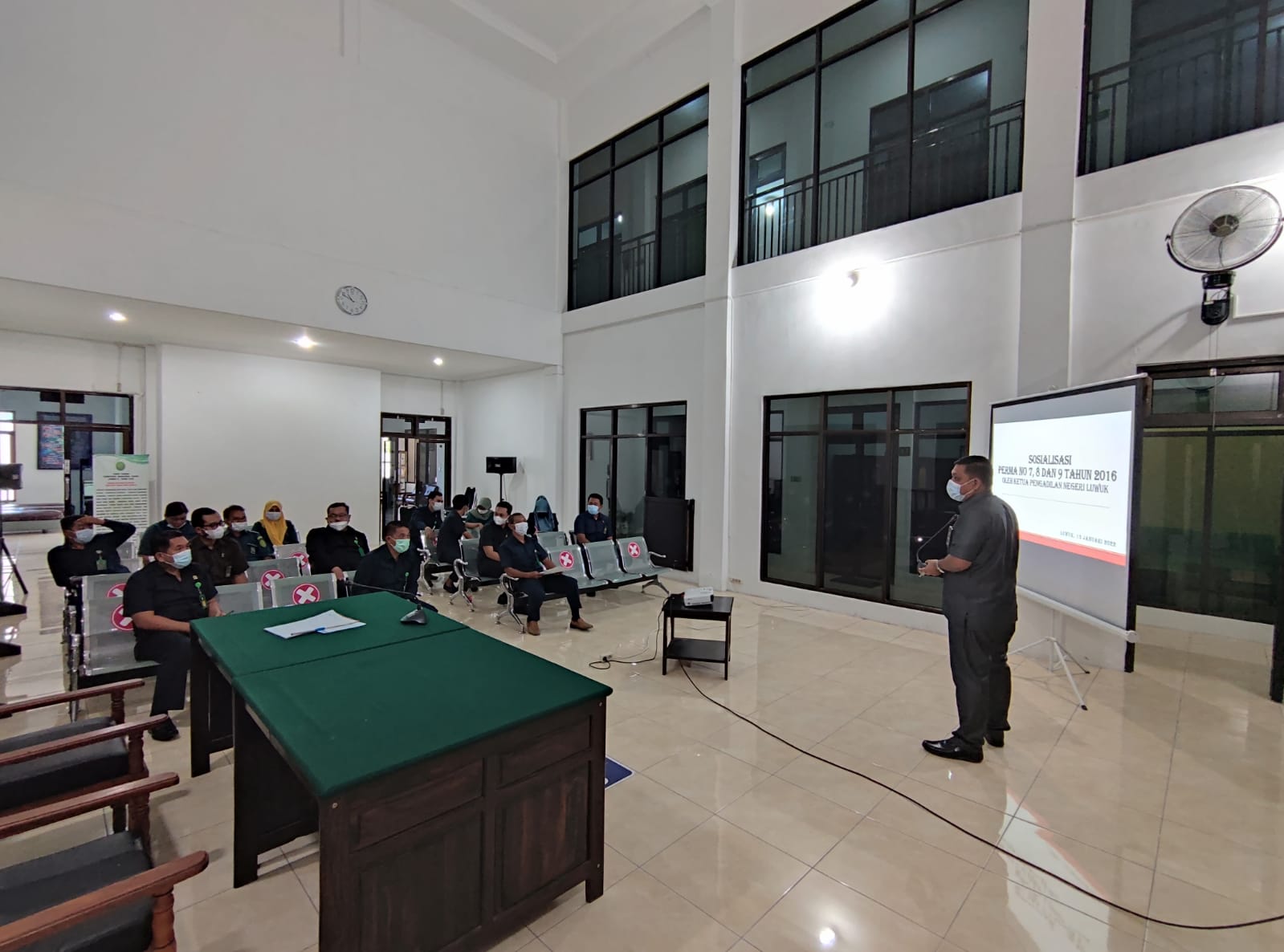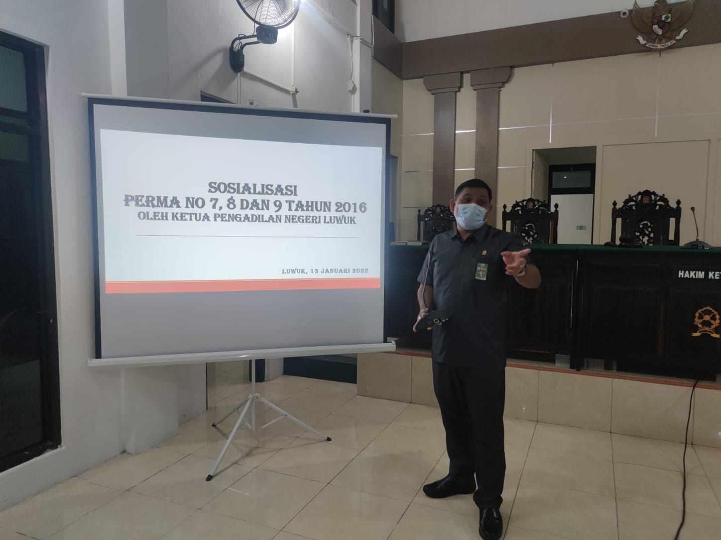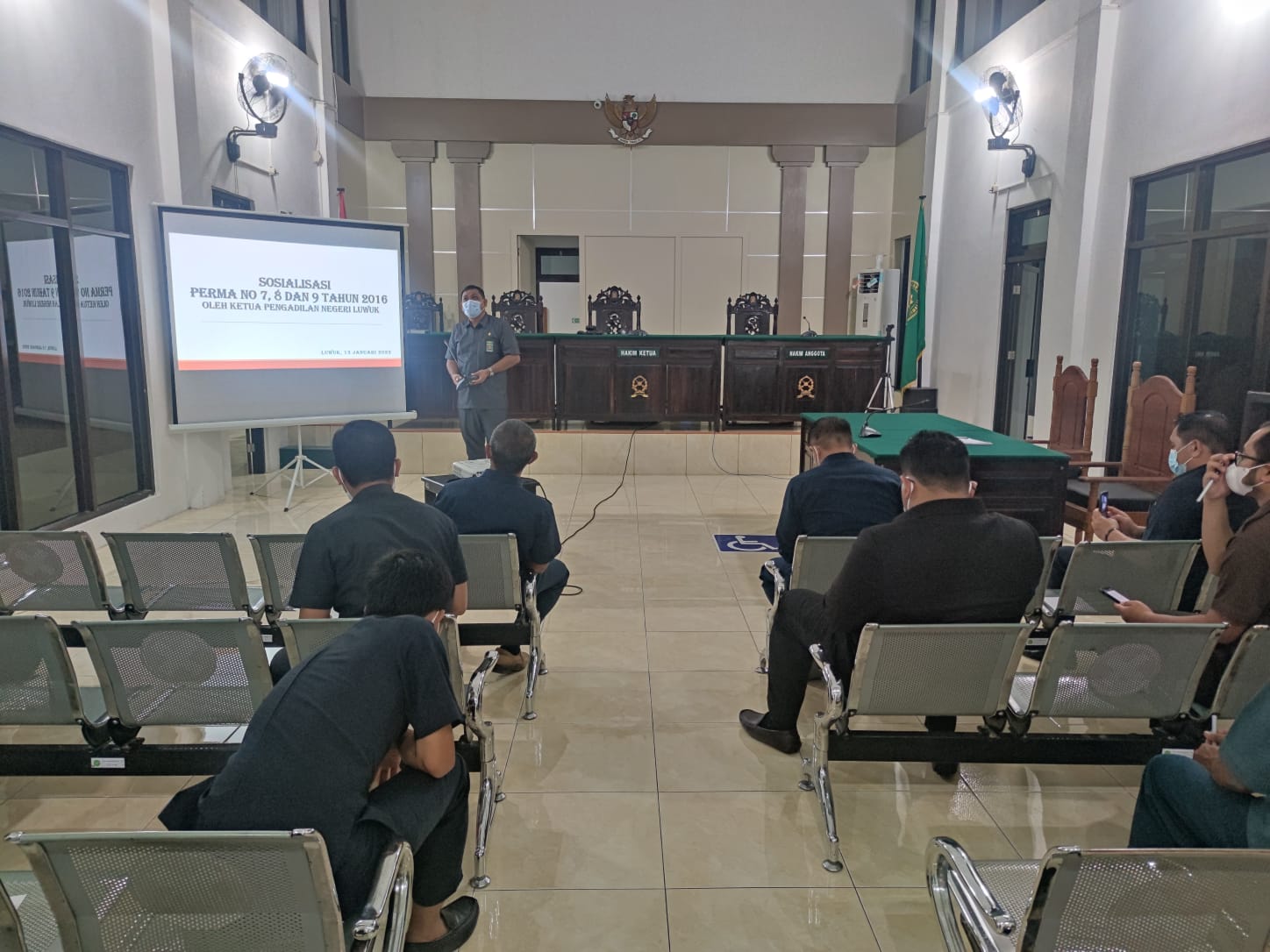 Luwuk, 13/01/2022. Bertempat di Ruang Sidang Utama Pengadilan Negeri Luwuk, Ketua Pengadilan Negeri Luwuk Bapak Andri Natanael Partogi, S.H., M.H. melakukan sosialisasi Perma 7,8 dan 9 Tahun 2016 kepada seluruh jajaran yang ada di Pengadilan Negeri luwuk.