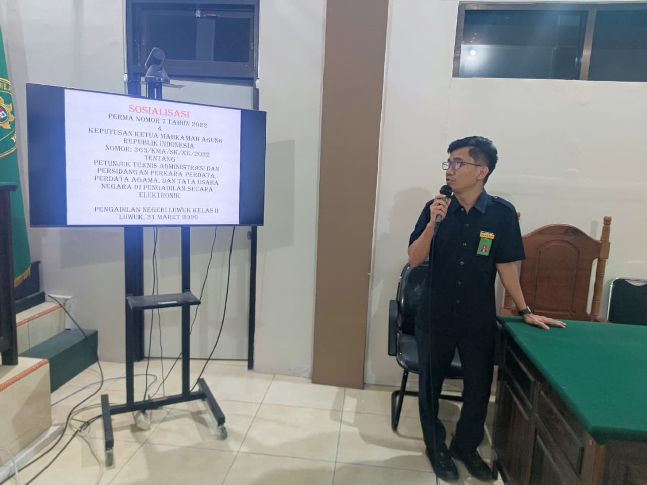 Luwuk, 31 Maret 2026. Pada hari Selasa pagi bertempat di Ruang Sidang Utama pada Pengadilan Negeri Luwuk, berlangsung kegiatan Sosialisasi Peraturan Mahkamah Agung Republik Indonesia (PERMA) Nomor 7 Tahun 2022 tentang Perubahan Atas Peraturan Mahkamah Agung Nomor 1 Tahun 2019 tentang Administrasi Perkara dan Persidangan di Pengadilan Secara Elektronik dan Surat Keputusan Ketua Mahkamah Agung Republik Indonesia (SK KMA) Nomor 363/KMA/SK/XII/2022 tentang Petunjuk Teknis Administrasi dan Persidangan Perkara Perdata, Perdata Agama, dan Tata Usaha Negara di Pengadilan Secara Elektronik. Sosialisasi ini dibawakan langsung oleh Bapak Risro Subiacto Nainggolan, S.H., M.H., selaku Hakim pada Pengadilan Negeri Luwuk. Sosialisasi ini dihadiri oleh seluruh Aparatur Peradilan pada Pengadilan Negeri Luwuk.