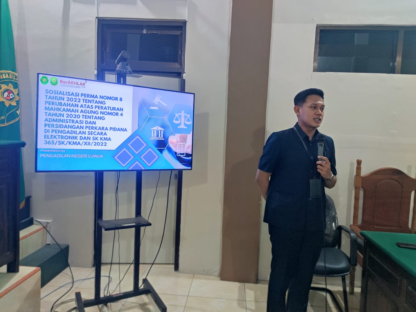 Luwuk, 31 Maret 2026. Pada hari Selasa pagi bertempat di Ruang Sidang Utama pada Pengadilan Negeri Luwuk, berlangsung kegiatan Sosialisasi Peraturan Mahkamah Agung Republik Indonesia (PERMA) Nomor 8 Tahun 2022 tentang Perubahan Atas Peraturan Mahkamah Agung Nomor 4 Tahun 2020 tentang Administrasi dan Persidangan Perkara Pidana di Pengadilan Secara Elektronik dan Surat Keputusan Ketua Mahkamah Agung Republik Indonesia (SK KMA) Nomor 365/SK/KMA/XII/2022 tentang Petunjuk Teknis Administrasi dan Persidangan Perkara Pidana di Pengadilan Secara Elektronik. Sosialisasi ini dibawakan langsung oleh Bapak Haidi Anshar, S.H., selaku Hakim pada Pengadilan Negeri Luwuk. Sosialisasi ini dihadiri oleh seluruh Aparatur Peradilan pada Pengadilan Negeri Luwuk.